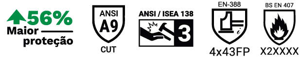 - Apresentam uma palma composta por 4 camadas de tecidos mistos, reforçada no polegar com costuras de aramida para garantir maior resistência contra riscos mecânicos e abrasivos.